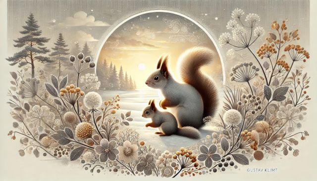 Bathed in the soft glow of a winter sun, a pair of Eastern Gray Squirrels nestles within a frosted Eden. Their soft fur contrasts strikingly with the cold, crisp earth, as they pause in a magical scenery, rendered beautifully in tones of burnished gold, icy blue, and creamy white. The circular vignette frames the serene sunset, casting a halo of light that dances subtly on the delicate flora surrounding the creatures. This piece marries the gentle intricacies of nature with the quiet strength of wildlife, inviting viewers into a tranquil realm where the chill of winter meets the residual warmth of fall. A poignant reminder of nature's gentle unfoldings, this illustration not only captures the beauty of the squirrels but also the fleeting, ethereal quality of seasonal transitions. *** About Eastern Gray Squirrel: The Eastern Gray Squirrel is a small mammal native to eastern North America. These agile creatures are highly adaptable, thriving in both woodland and urban areas. Their diet primarily consists of nuts, seeds, buds, and flowers, though they are known to occasionally indulge in insects and small animals. Eastern Gray Squirrels play a crucial role in their ecosystems by dispersing seeds, thus aiding in forest regeneration. Typically, these squirrels are active during the early hours and late afternoon, avoiding midday heat. Mating seasons occur twice a year, with peak times in late winter and late summer, leading to a fascinating display of chases and acrobatics among prospective mates.