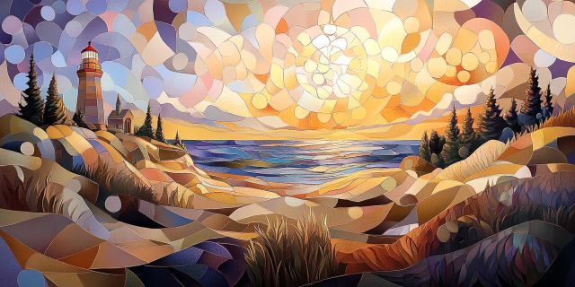 Bathed in the golden hues of a setting sun, the coastal landscape depicted in the artwork radiates an ethereal charm. The composition opens with a picturesque lighthouse standing sentinel over a rugged shoreline, guiding wayfarers through the ebbing tides. Meticulously crafted in a mosaic style, each segment of the painting interlocks in harmonious patterns, echoing the intricate beauty of nature. The expansive sky serves as a backdrop, with its palette of warm ambers and cool violets merging into the tranquil sea below. This artwork not only captures the spirit of nautical navigation but also inspires a sense of peace and contemplation. The striking contrast between the structured, stone-built lighthouse and the organic flow of the landscape offers a visual feast that celebrates the dance between man-made constructs and natural elements. *** About Lighthouse: Lighthouses have served as navigational aids for mariners at sea for centuries. Typically located at promontories or busy sea lanes, these structures emit lights to warn and guide vessels, ensuring safe entry to harbors or passage past treacherous coastlines. Beyond their functional role, lighthouses are steeped in a rich history and romantic allure, often symbolizing strength, guidance, and steadfastness. This depicted lighthouse, with its classic cylindrical design and prominent lantern room, stands as an iconic representation of maritime safety and architectural ingenuity.