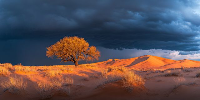 Bathed in the warm glow of the setting sun, a lone tree stands defiantly amid the undulating dunes of a vast desert. The scene is a striking juxtaposition of vibrant orange hues against a backdrop of impending storm clouds, presenting a surreal and dramatic landscape. The golden light accentuates the texture of the sand and the ruggedness of the tree, which despite the harsh conditions, thrives in solitude. This evocative image not only captures the harsh beauty of desert environments but also reflects the resilience and adaptability of life in extreme conditions. The contrast between the sunlit dunes and the brooding sky creates a profound visual impact, inviting viewers to ponder the forces of nature and the persistence of life. *** About Desert Ecosystems: Desert ecosystems are characterized by their extreme conditions—scorching temperatures during the day and plummeting ones at night. Despite these challenges, deserts are home to a variety of life forms that have adapted to survive with minimal water. Plants like the one featured in this image have developed abilities to store water and manage with reduced photosynthetic activity. Animals and plants in desert environments often show fascinating evolutionary adaptations, making these regions rich in biodiversity and scientific interest. Studies of these ecosystems continue to contribute significantly to our understanding of ecological resilience and adaptation.