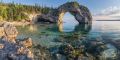 Majestic Arch Rock at Sunrise Over Lake Michigan's Clear Waters
