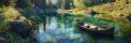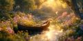 Serene Sunrise Over Dreamy Floral River with Peaceful Canoe