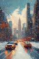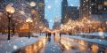 Warm Lights Glowing on Snowy Streets Amid Towering Skyscrapers
