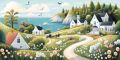 Idyllic Coastal Village Captured in Vibrant Illustrative Artwork
