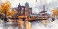 Bustling Detroit Market Scene with Colorful Watercolor Skyline