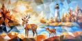 Geometric Harmony: Deer and Lighthouse at Lakeside Dawn