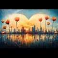 Vibrant Sunset Over Detroit Skyline Framed by Blossoming Poppies
