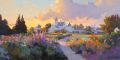 Sunset Glow Over Idyllic Village with Flourishing Gardens
