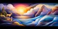 Surreal Sunset over a Stylized Landscape with Grazing Deer